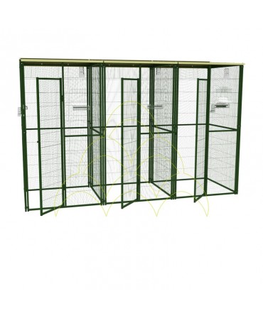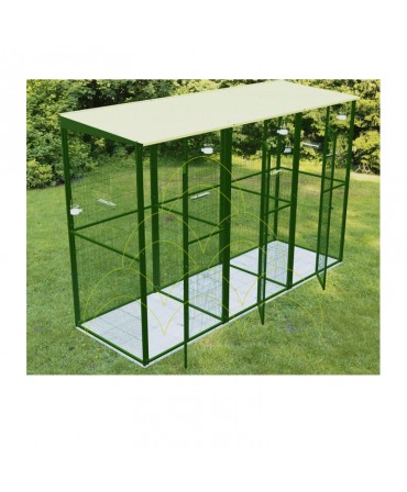 The Parrot Nursery - 4m² with mixed roof (cover + mesh) is the ideal solution for creating a safe and comfortable environment for parrots and other birds. With its spacious design, it allows species to be separated into two compartments, ensuring practical handling. Equipped with rotating feeders and sturdy panels, it offers protection from the weather and ease of feeding, while its robust structure ensures safety and durability.