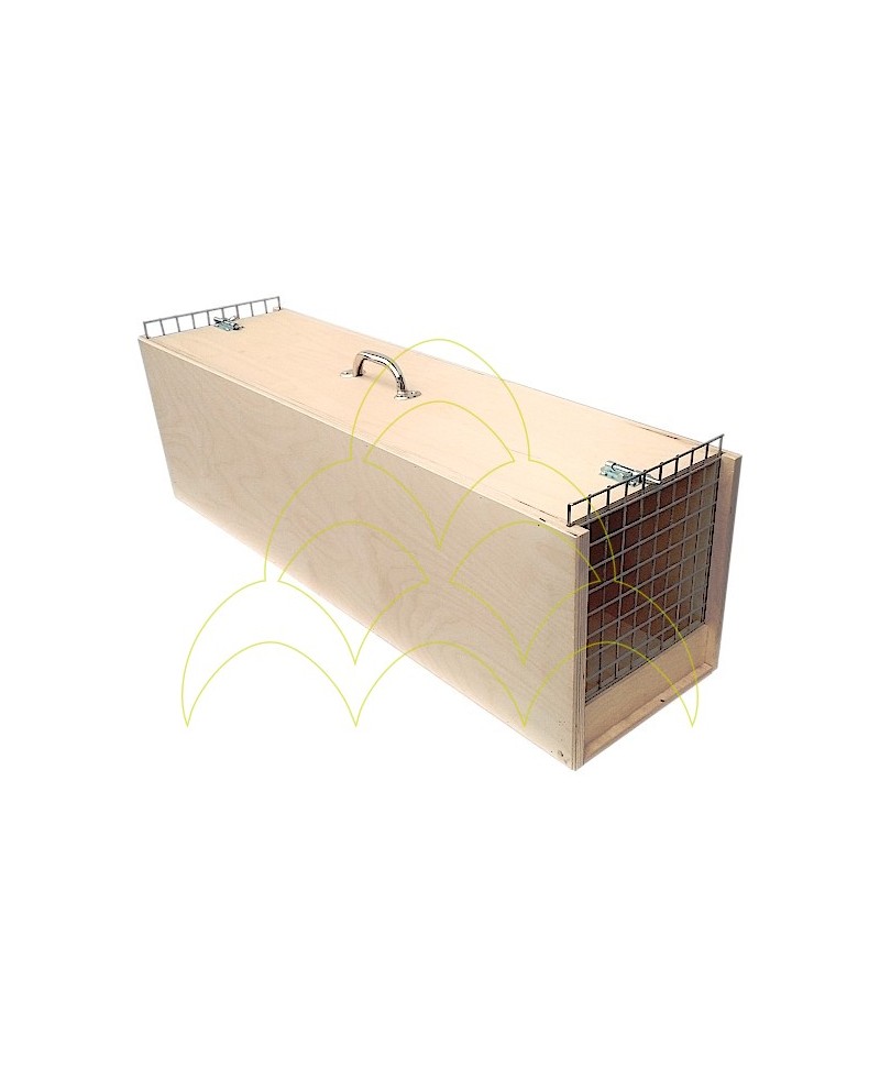 Macaws two-fronts portable nest 90cm long, in pine plywood, with 2 metal mesh doors and lock and an ergonomic handle to carry it comfortably.