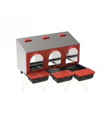 Ninho com recolha de ovos de aplicação interior para galinhas em contraplacado de madeira. A bandeja frontal permite armazenar entre 24 a 36 ovos e a sua recolha faz-se através de uma tampa que facilmente se abre e eleva com uma só mão.