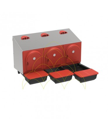 Ninho de aplicação interior para galinhas em chapa galvanizada e com uma nova bandeja em plástico fácil de remover para melhor limpeza e desinfecção. O depósito frontal permite armazenar entre 8 a 12 ovos e a sua recolha faz-se através de uma tampa que facilmente se abre e eleva com uma só mão.