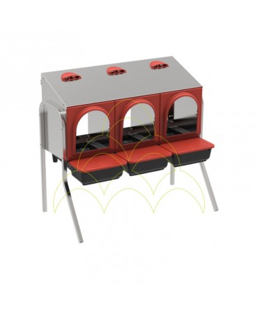 Ninho de aplicação interior para galinhas com pernas metálicas em chapa galvanizada e com uma nova bandeja em plástico fácil de remover para melhor limpeza e desinfecção. O depósito frontal permite armazenar entre 8 a 12 ovos e tem uma tampa que facilmente se abre e eleva com uma só mão para recolher os ovos.