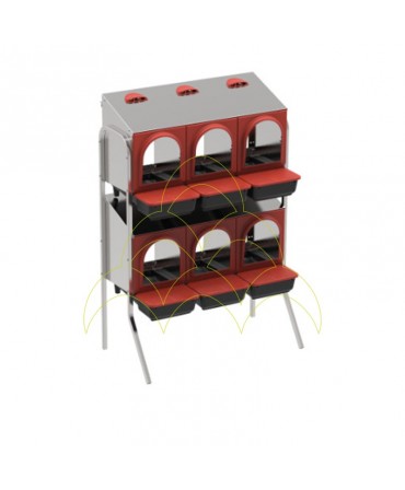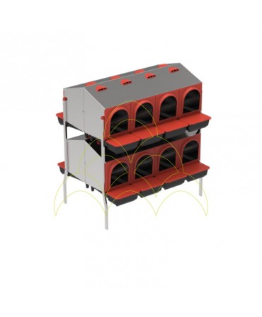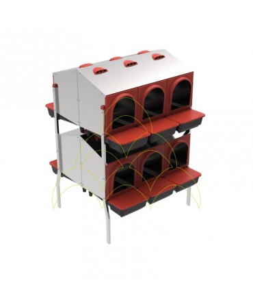 Ninho de aplicação interior de 12 compartimentos, em 2 pisos, acomoda até 72 galinhas poedeiras. Fabricado em chapa galvanizada, inclui pernas metálicas para instalação no chão ou em altura. As bandejas removíveis, de plástico anti-séptico, são fáceis de limpar. Cada compartimento armazena 8 a 12 ovos, com tampa ergonómica para recolha prática. O design inclui textura antiderrapante para maior conforto das aves e ventilação no telhado para evitar condensação.