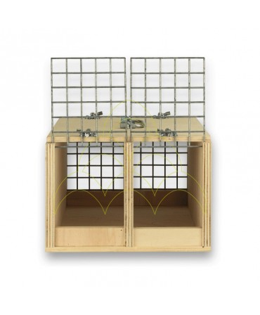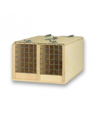 Transportadora de 2 divisórias, fabricada em contraplacado de pinho, produto extremamente sólido, de elevada resistência à água. Rede italiana extremamente resistente. Ambas as portas, frontal e traseira facilitam a mobilização da ave, sem a perturbar.